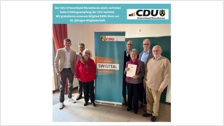 Der CDU Ortsverband Morenhoven war beim Frühlingsempfang der CDU Swisttal stark vertreten und hat den Vormittag für viele gute Gespräche genutzt. Ein ganz besonderer Moment war die Ehrung unserer Edith Klein, die wir zur 50-jährigen Mitgliedschaft beglückwünschen konnten. Ein halbes Jahrhundert Treue zur CDU ist eine beachtliche Leistung, vor der wir großen Respekt haben.