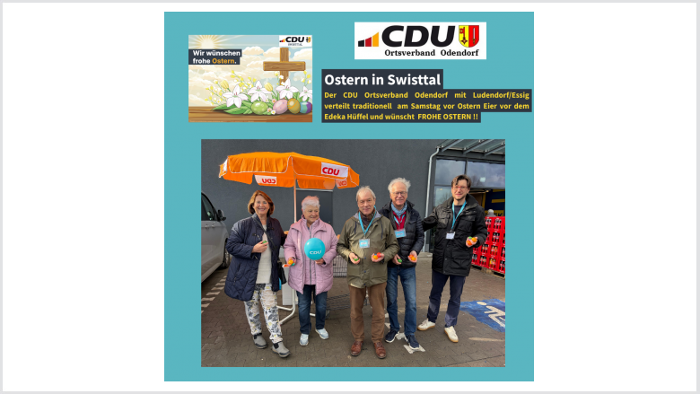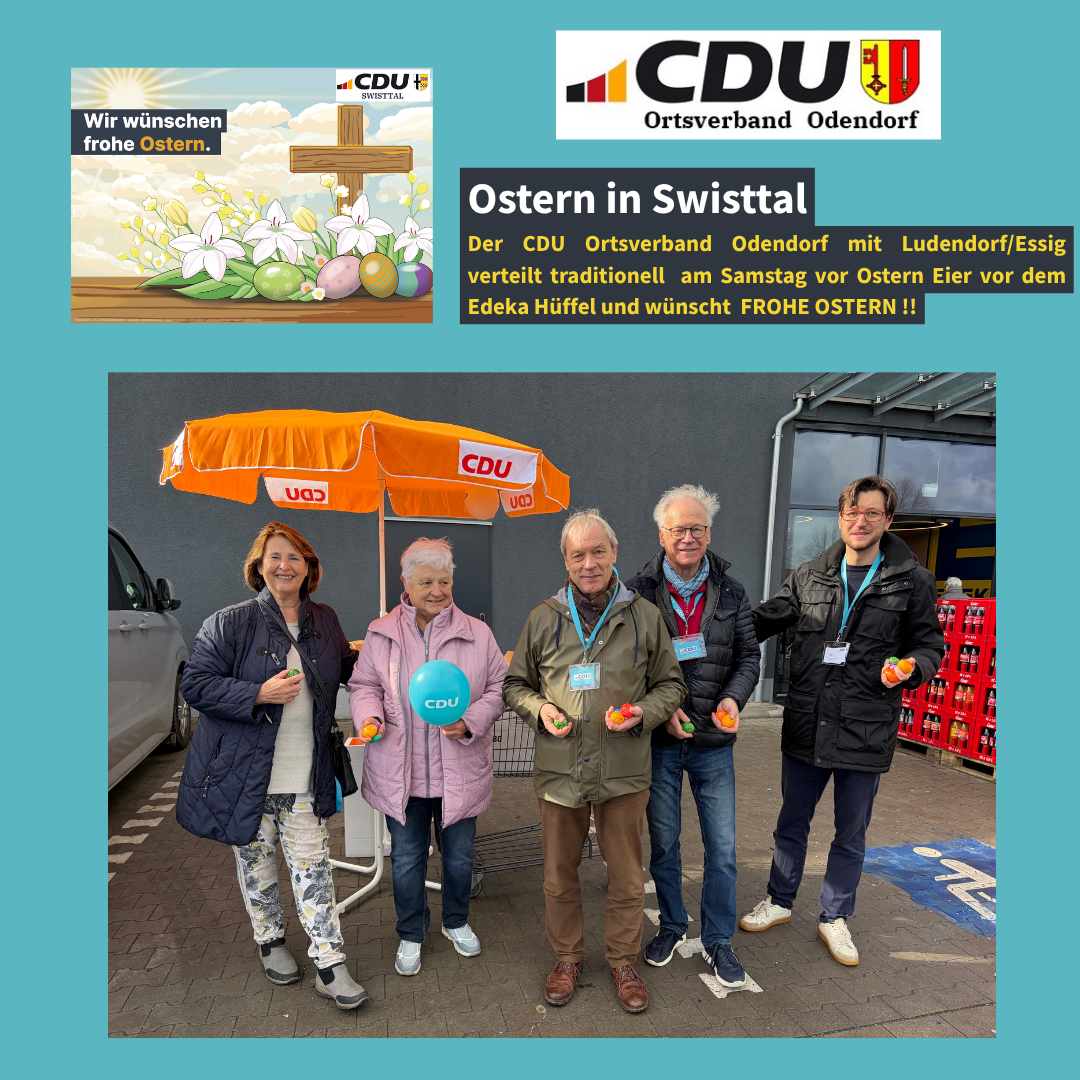 Das gerade neu gewählte Führungsteam des CDU Ortsverbandes Odendorf, Vorsitzender Frank Oberbeck und sein Stellvertreter Kai Hamacher,ließen es sich nicht nehmen, auch in diesem Jahr der Tradition folgend am Samstag vor Ostern Ostereier an die Bevölkerung zu verteilen . Sie wurden dabei unterstützt von dem CDU Gemeindeverbandsvorsitzenden Bernd Großmann-Lemaire, von Elisabeth Kümpel und der OV Vorsitzenden aus Ludendorf/Essig , Gertrud Klein.
