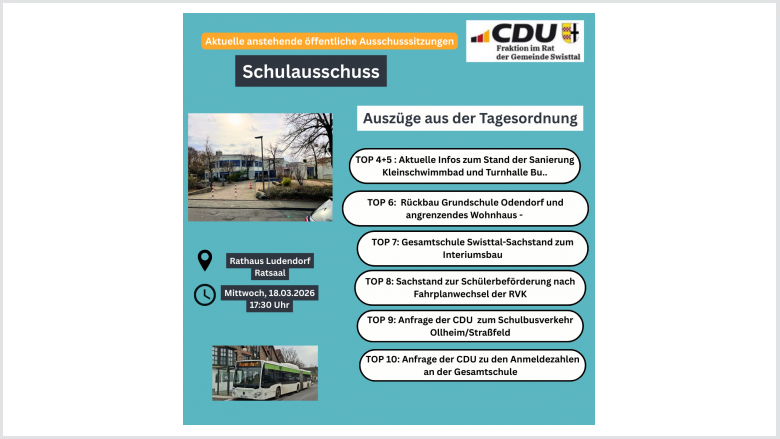 Die CDU Fraktion hat zwei Anfragen gestellt, die im Ausschuss behandelt werden. Unsere Nachfrage zum Schulbusverkehr wurde nicht den Auschussunterlagen beigefügt.