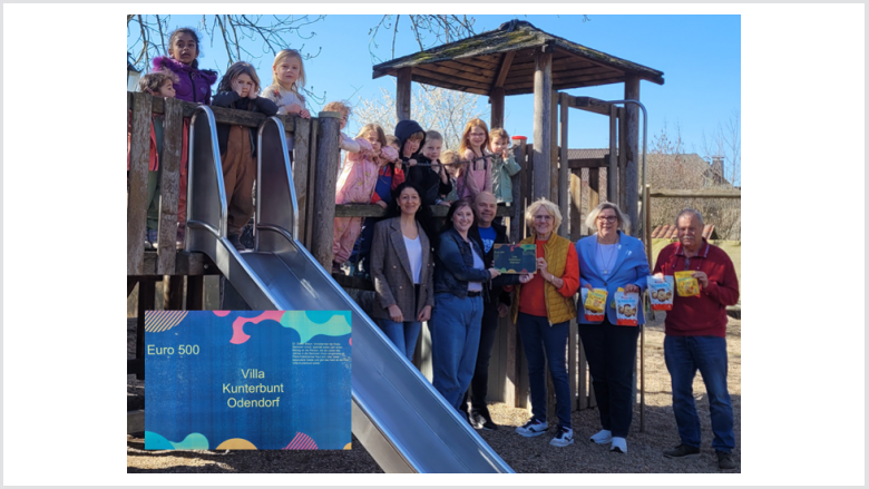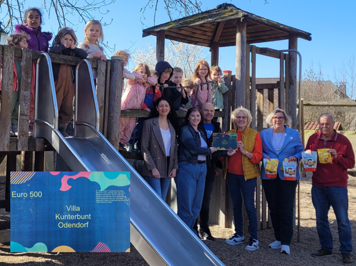 Große Freude herrschte in der Odendorfer Kita Villa Kunterbunt bei der Übergabe einer Spende für ein neues Spielgerät, das den Garten noch schöner und vielfältiger für die Kinder machen soll. Anwesend waren der Leiter der Kita Herr Helmut Schmitt, Frau Franziska Troll und Frau Patrizia Schulz sowie zahlreiche Kinder der Einrichtung.