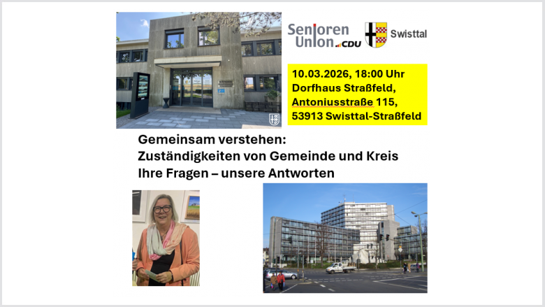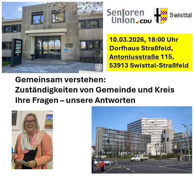 Die Seniorenunion der CDU Swisttal lädt ganz herzlich ein zu ihrer ersten Veranstaltung in 2026. Wir würden uns sehr freuen, wenn viele von Ihnen kommen und gemeinsam mit uns einen schönen und interessanten Auftakt unter dem Motto erleben: